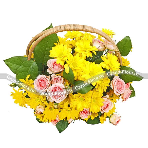 Стандартный (на фото): хризантема кустовая ромашковая - 9 шт., роза кустовая розовая - 3 шт., салал, оазис, корзина.