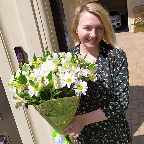 ДЕЛЮКС: хризантема кустовая ромашковая - 15 шт, фрезия/альстромерия белая - 10 шт, альстромерия белая - 14 шт, салал, фетр зеленый, натуральная упаковка.
