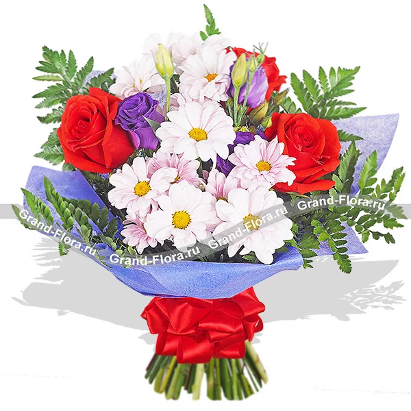 Уменьшенный: роза красная - 3 шт., хризантема кустовая  светло фиолетовая - 1 шт., эустома фиолетовая - 1 шт., папоротник - 3 шт, фетр синий, бант красный.