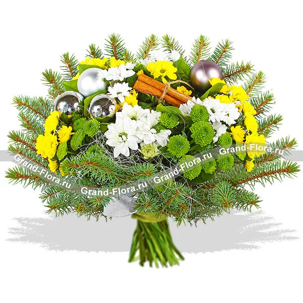 ДЕЛЮКС: хризантема желтая ромашковидная - 12шт., хризантема зеленая (сантини) - 8шт., хризантема белая ромашковидная - 10шт., еловая ветвь, корица, новогодний декор и зелень, сетка.