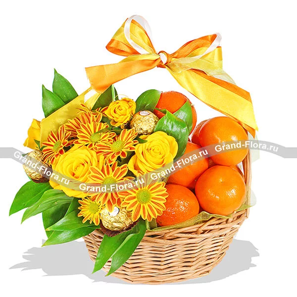 Стандартный: мандарины - 1 кг., конфеты "Ferrero Rocher" - 1 шт., хризантема оранжевая - 2 шт., роза кустовая желтая - 2 шт., декоративная зелень, оазис, корзина средняя, желтый фетр, желто-оранжевый бант.