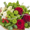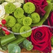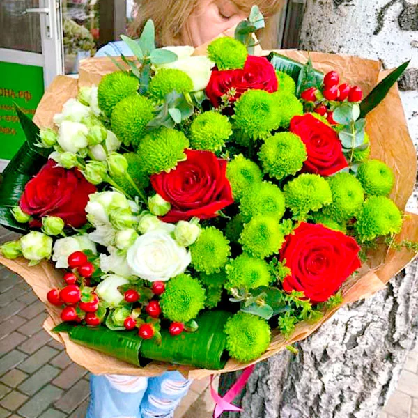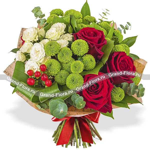 ДЕЛЮКС: роза красная - 9 шт., роза кустовая белая - 6 шт., хризантема кустовая зелёная 8 шт., аспидистра - 5 шт., эвкалипт - 4 шт., салал 4 шт., гиперикум - 5 шт., упаковка крафт, лента. Примерный размер: 45Х45см.