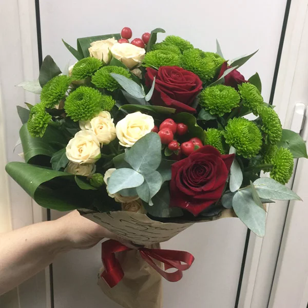 Стандартный (на фото): роза красная - 3 шт., роза кустовая белая - 2 шт., хризантема кустовая зелёная - 3 шт., аспидистра - 2 шт., эвкалипт - 1 шт., салал 2 шт., гиперикум - 2 шт., упаковка крафт, лента . Примерный размер: 25Х25 см.