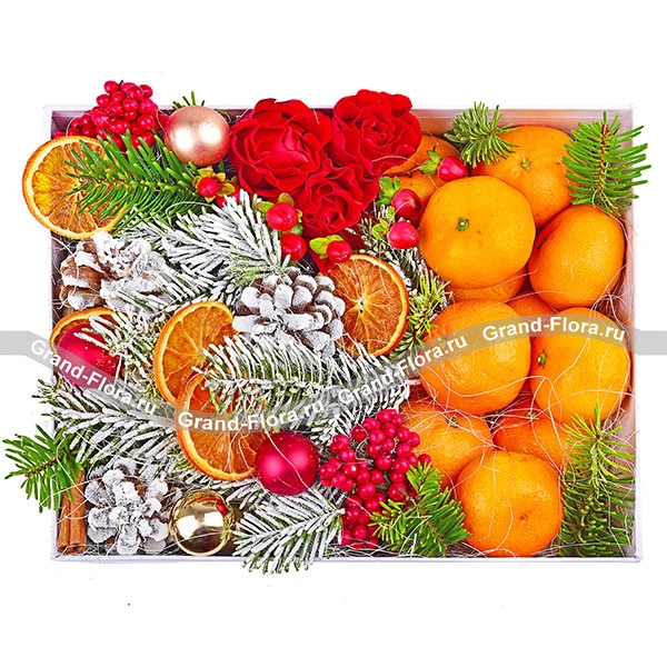 Уменьшенный: кустовые розы - 1шт., ель., гиперикум - 1шт., шишки - 2шт., елочные шарики - 2 шт., новогодний декор., мандарины - 0,5 кг., коробка.
