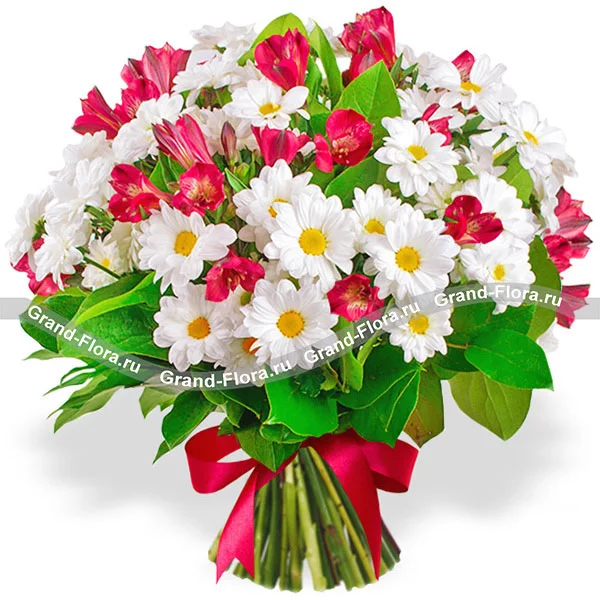 Стандартный: хризантема кустовая ромашковидная - 10 шт., альстромерия красная - 5 шт., декоративная зелень., упаковка, лента красная.