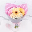 Уменьшенный: роза белая - 4 шт., гербера розовая/оранжевая - 1 шт., гербера желтая/кремовая - 2 шт., упаковка, лента. Примерный размер: 20Х20 см.