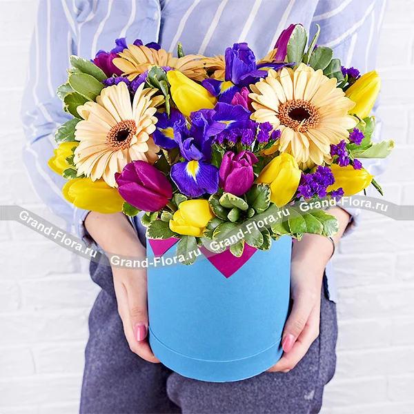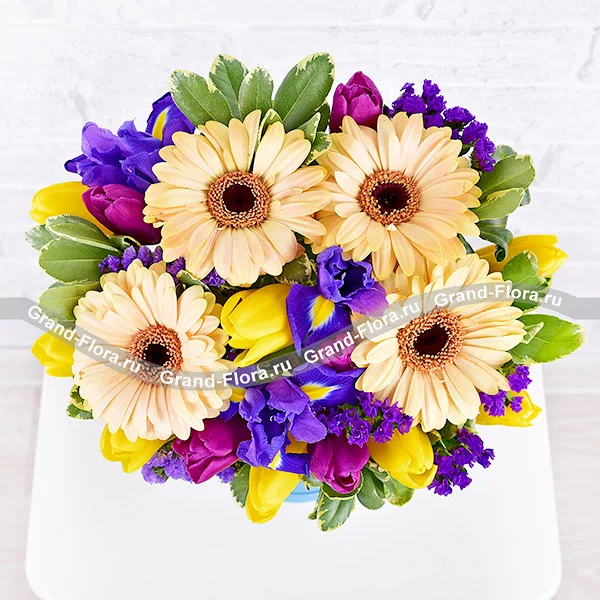 Стандартный: гербера желтая - 4 шт., тюльпан желтый - 8 шт., тюльпан фиолетовый - 6 шт., ирис синий - 3 шт., декоративная зелень, статица, оазис, коробка.