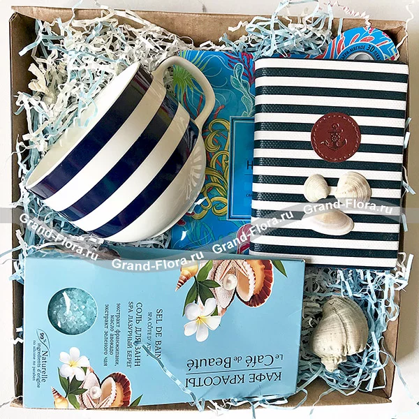 Стандартный: блокнот-ежедневник - 1шт., чашка - 1 шт., маска для лица «Deep sea» - 1 шт., соль для ванны «Лазурный берег» - 1 шт., подарочная коробка, наполнитель, декор (ракушки).